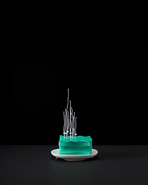 Plant #7, 2021. Ceramic soap dish, scrubber sponge, spaghetti, orange rubber paint, metallic foil from product packaging, 11 7⁄16 × 5 1⁄8 × 3 1⁄8 (29 cm × 13 cm × 8 cm).