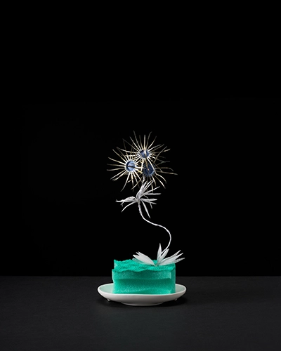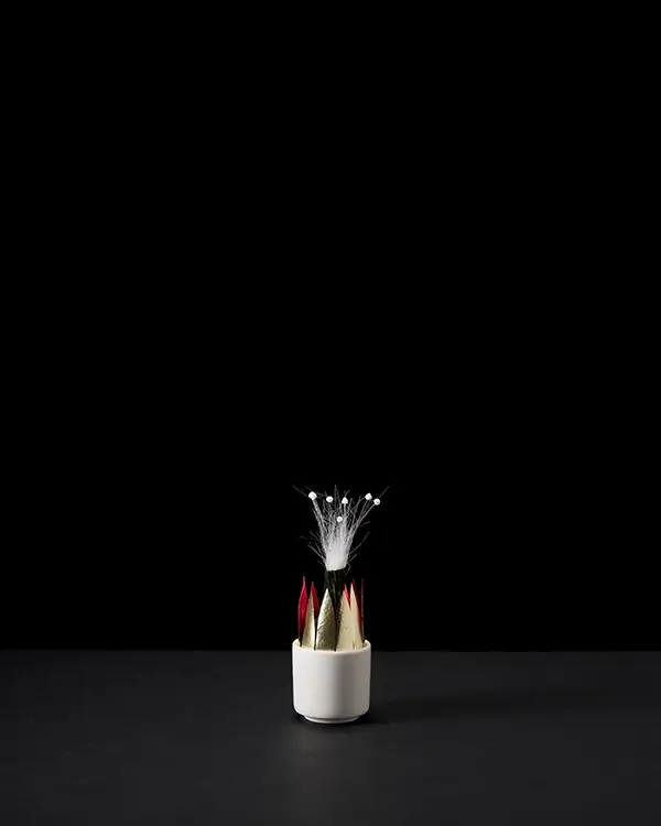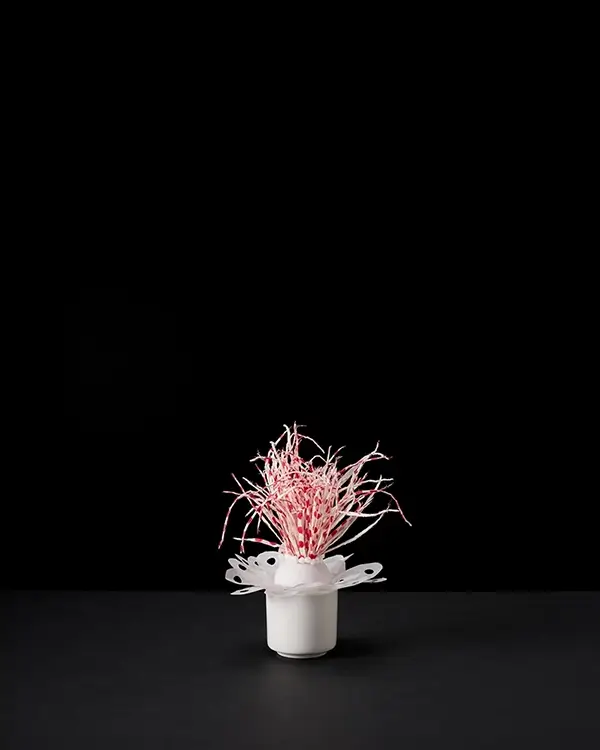 Plant #12, 2021. Ceramic eggcup, metallic foil from product packaging, crepe paper, monofilament, polystyrene beads, 5 7⁄8 × 1 15⁄16 × 1 15⁄16 inches (15 cm × 5 cm × 5 cm).