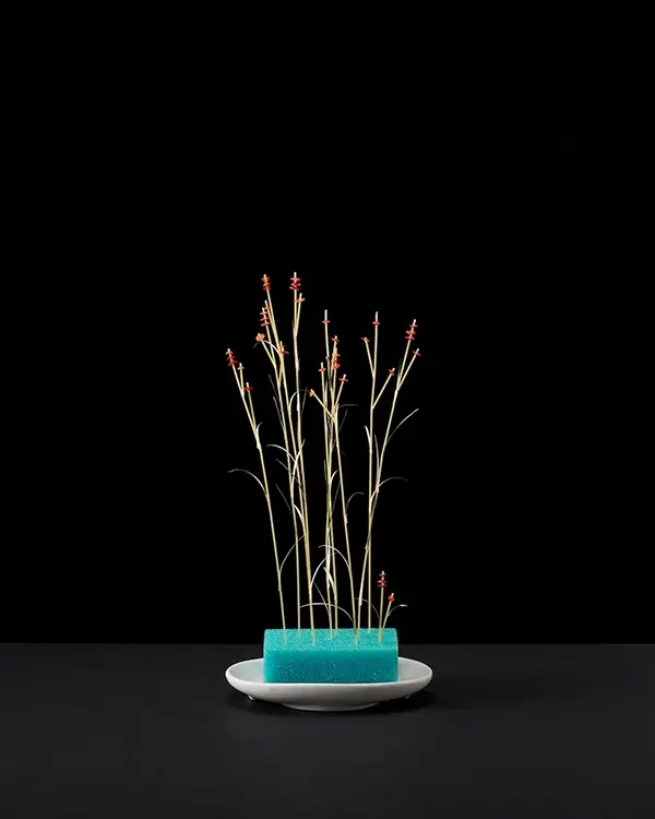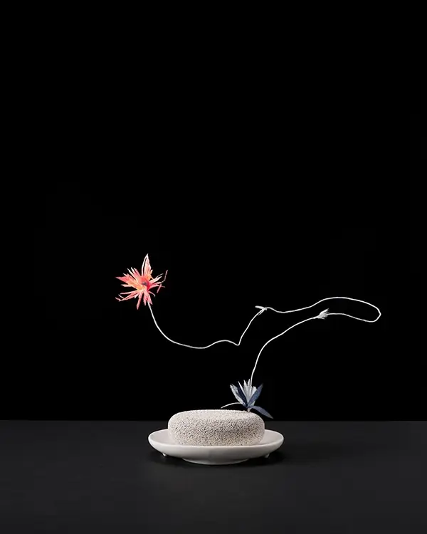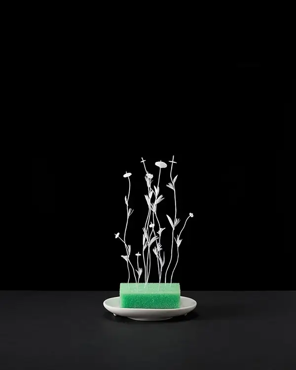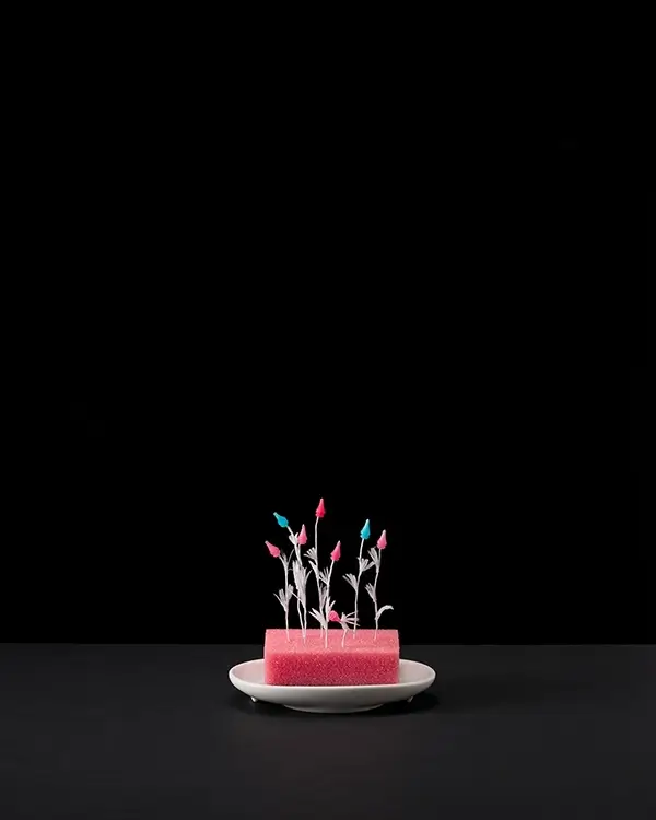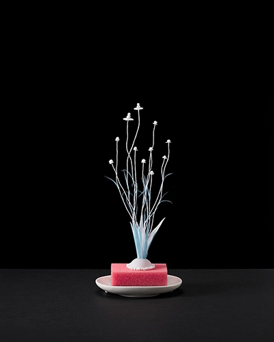 Plant #8, 2021. Ceramic soap dish, pumice block, paper-covered wire, crepe paper, rubber tip from dental brush, glass-head Pin, 9 13⁄16 × 8 11⁄16 × 8 11⁄16 (25 cm × 22 cm × 22 cm).