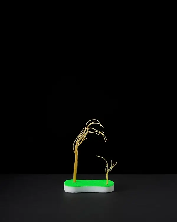 Plant #6, 2021. Ceramic soap dish, scrubber sponge, paper-covered wire, rubber tips from dental brushes, 5 1⁄2 × 5 1⁄8 × 3 1⁄8 inches (14 cm × 13 cm × 8 cm).