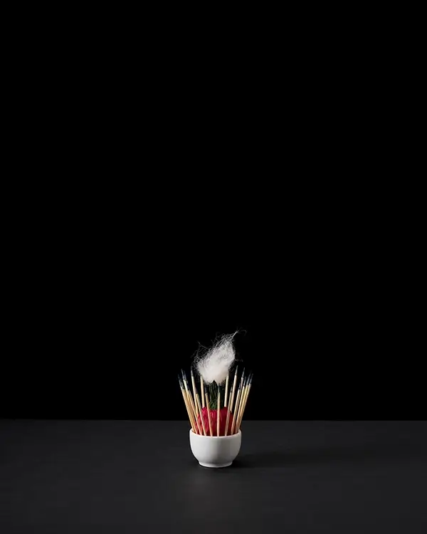Plant #11, 2021. Ceramic eggcup, ping pong ball, crepe paper, wool, toothpicks, ink, 10 1⁄4 × 5 1⁄8 × 5 1⁄8 inches (26 cm × 13 cm × 13 cm).