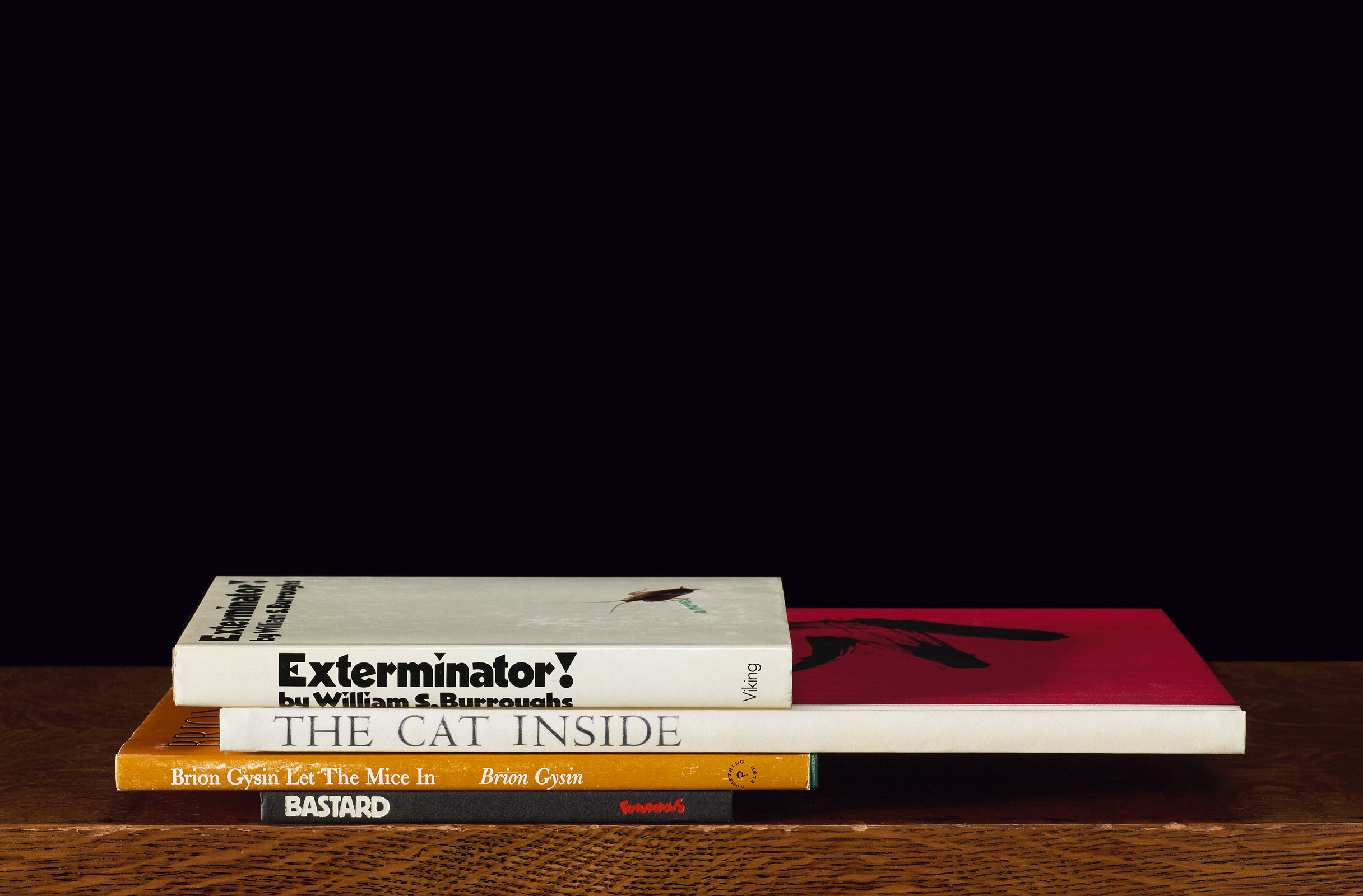 In each installment of my “Sorted Books” project (1993 and ongoing), I scour an individual’s or institution’s bookshelves in search of titles that, when arranged in sequence, form short phrases, stories, poems, or commentary. The resulting photographs serve as a portrait of the collector. My subjects have included the artist Isamu Noguchi, the writers William S. Burroughs and August Strindberg, a collection of books on magic at Brown University, and several of my friends.